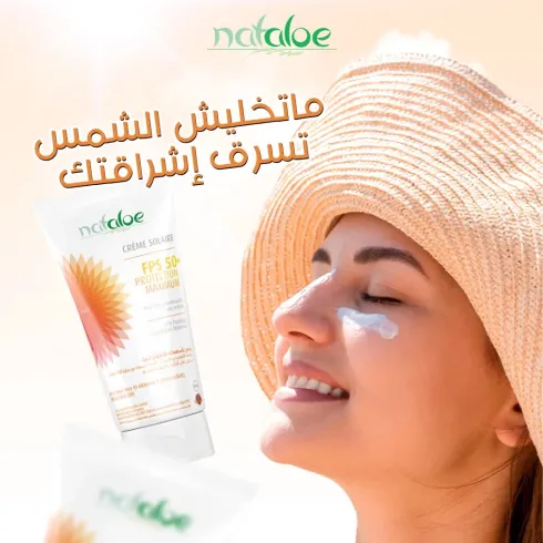 ما تخليش الشمس تسرق إشراقتك! ☀️مع كريم واقي الشمس من ناتالوي، احمي بشرتك من الأشعة الضارة، واحتفظي بنضارتك وإشراقتك طول اليوم.تركيبة خفيفة، ترطيب يدوم، وحماية مضمونة.Ne laisse pas le soleil voler ton éclat ! ☀️Avec la crème solaire Nataloe protège ta peau des rayons UV nocifs et garde ta fraîcheur et ton éclat toute la journée.Une texture légère, une hydratation longue durée et une protection garantie.