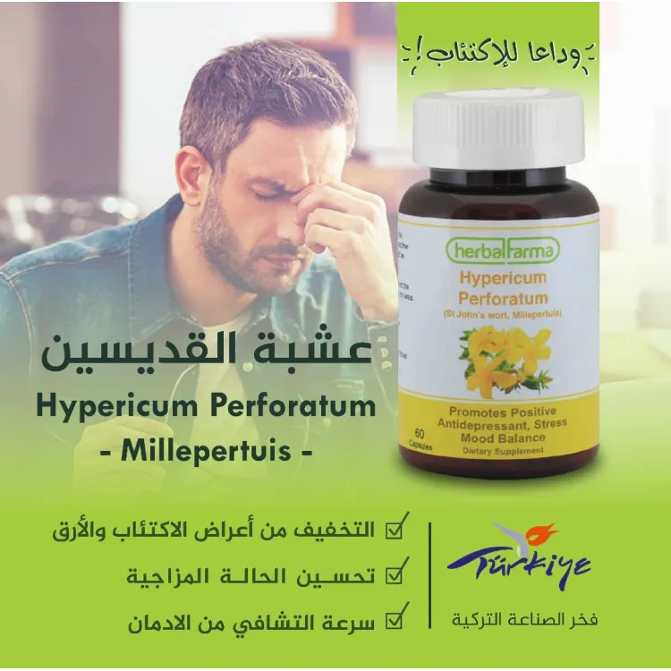 المنتج الأكثر شهرة في أوروبا لتعديل المزاج والاضطرابات النفسية كالقلق والاكتئاب.الاسم العلمي: Hypericum perforatumوهي مشهورة باسم : عشبة القديسين أو القديس يوحنا St.John.s wort و من اسمائها أيضا عشبة النبي يحيى عليه السلام، و عشبة القلب ، والـهيوفاريقون.وكما تساعد في:- الحد من حالات الاكتئاب و سائر مضاعفاته كالقلق الشديد، التعب، الأرق، فقدان الشهية، و اضطرابات النوم، وذلك بفضل غناها ببعض مضادات الاكتئاب، مثل السيتالوبرام، والفلوكستين، وأيضاً السيرترالين.- اضطراب الوسواس القهري و حالات الاكتئاب الموسمي.- حالات الخفقان القلبي، وفي تقلبات المزاج و مشاكل التغيرات الهرمونية والنفسية لدى النساء في مرحلة انقطاع الدورة الشهرية لديهن .- لتقوية الانتباه و التركيز.- فعالة ضد الإجهاد ومتلازمة التعب المزمن، وداء الشقيقة و غيرها من آلام الرأس، و الآلام العضلية و الأوجاع العصبية.- يساعد في التخفيف من أعراض القولون العصبي. في دراسة علمية حديثة أجريت في النمسا تبين أن 70 % من المرضى الذين يعانون من الاكتئاب تحسنت حالتهم باستعمال مستحضر Hypericum perforatum أي عشبة القديس يوحنا وبذلك أصبحت من أكثر العلاجات المستخدمة في حالات الاكتئاب والاضطرابات النفسية بمختلف أنواعها ،لفعاليتها من ناحية ولخلوها من التأثرات الجانبية للأدوية الكيماوية من ناحية أخرى .